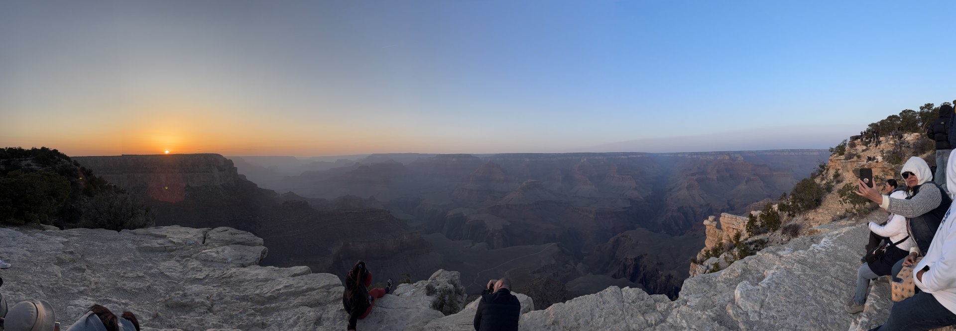 再びシャトルバスを乗り継いで、ビジターセンターまで戻り、だいぶ陽も傾いてきたので、今夜宿泊するヤパバイ・ロッジにチェックインすると、再び、夕陽を拝みに、ヤパバイ・ポイントへと向かう。 この日は6時40分過ぎに日没を迎えたが、夕陽の絶景ポイントということで、多くの人たちが訪れていた。 天気も良く、アメリカの大地、グランドキャニオンに沈む美しい夕陽を拝むことができた。